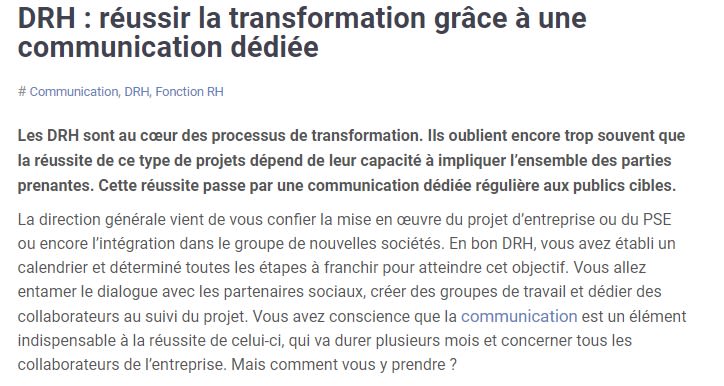 La communication doit faire partie intégrante du projet de transformation dès son lancement. Il est important qu’une personne ou mieux, une équipe, soit uniquement dédiée à cet aspect du projet. Elle devra participer à toutes les réunions afin d’en avoir en permanence une vision globale. Si, dans votre entreprise, la communication interne n’est pas rattachée à la DRH, je vous conseille de créer une task force commune avec la direction de la communication. Vous veillerez ainsi à ce que s’établisse une réelle relation de confiance entre ces deux directions.