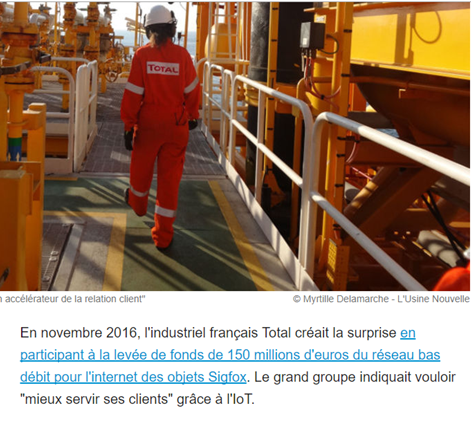En novembre 2016, l'industriel français Total créait la surprise en participant à la levée de fonds de 150 millions d'euros du réseau bas débit pour l'internet des objets Sigfox. Le grand groupe indiquait vouloir "mieux servir ses clients" grâce à l'IoT.